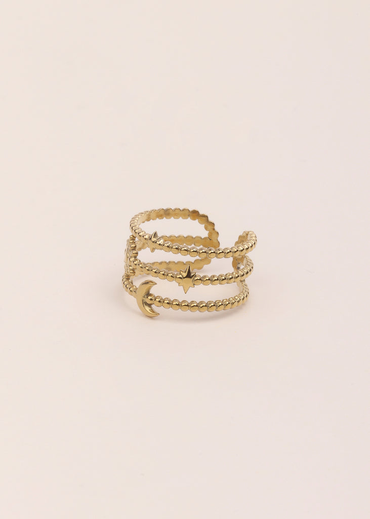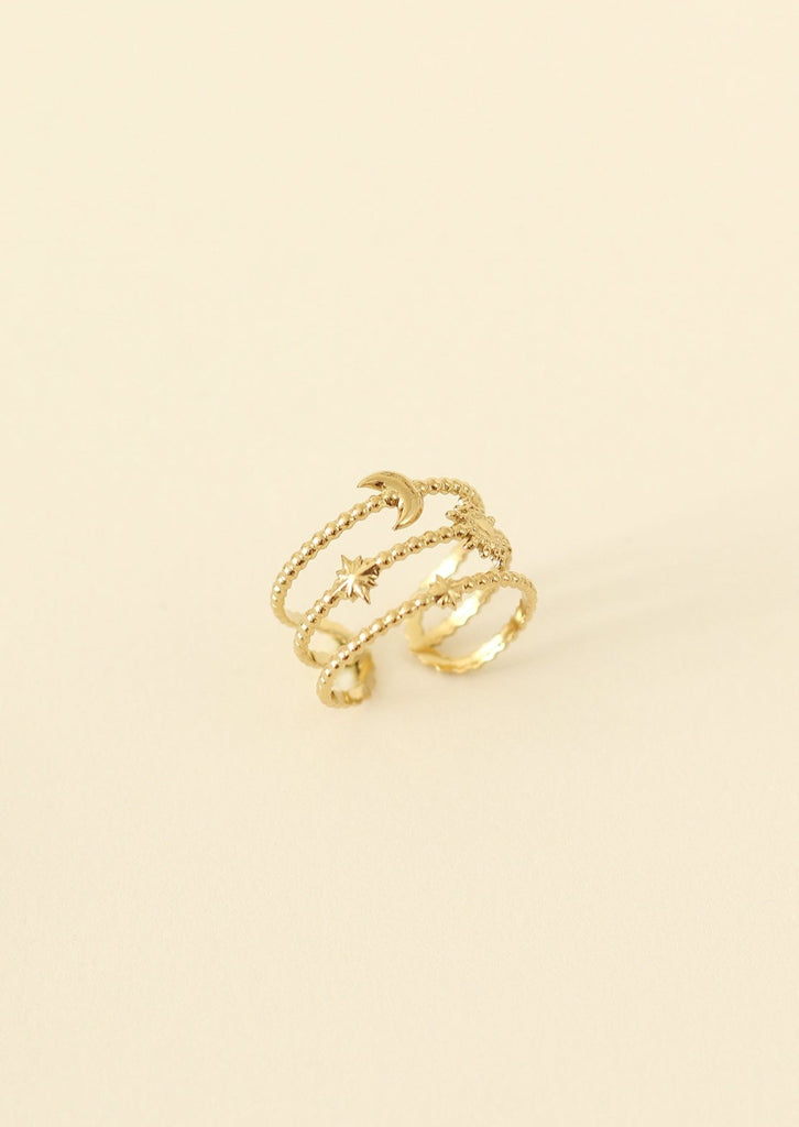 Bague trois rangs avec motifs lune et étincelles.