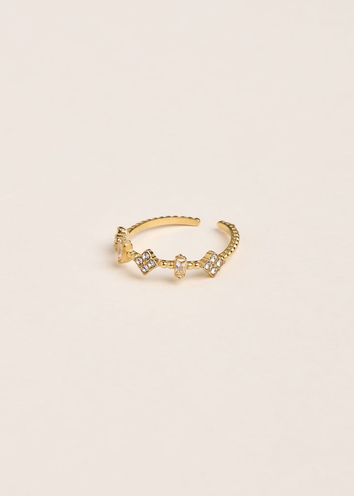 Craque pour cette bague dorée ouverte aux motifs géométriques sertis de zircons étincelants. À la fois élégante et moderne, elle apporte une touche de lumière à ta main. Son design finement travaillé s’adapte à toutes les morphologies grâce à sa structure ajustable.