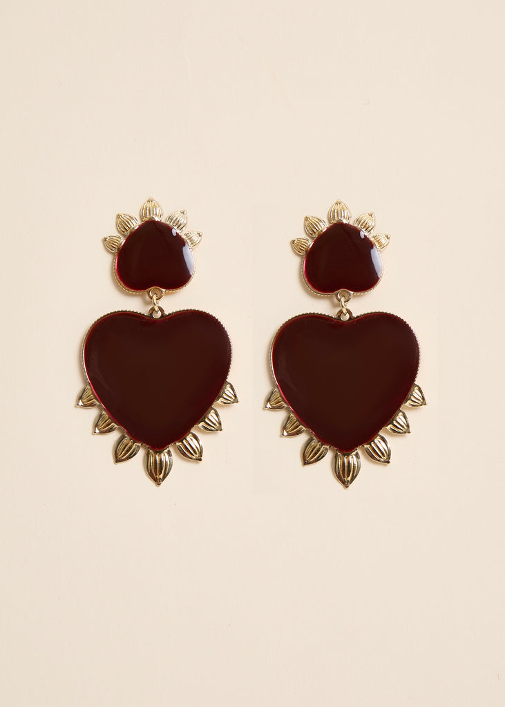 Le cœur principal, de dimensions généreuses (3 cm de haut et de large) et petit cœur (1,5 cm de haut et de large) , sont recouverts d'un émail bordeaux brillant profond et intense. Leur singularité réside dans les pics dorés qui ornent sa base, apportant une touche edgy et un contraste saisissant avec l'élégance du bordeaux.
