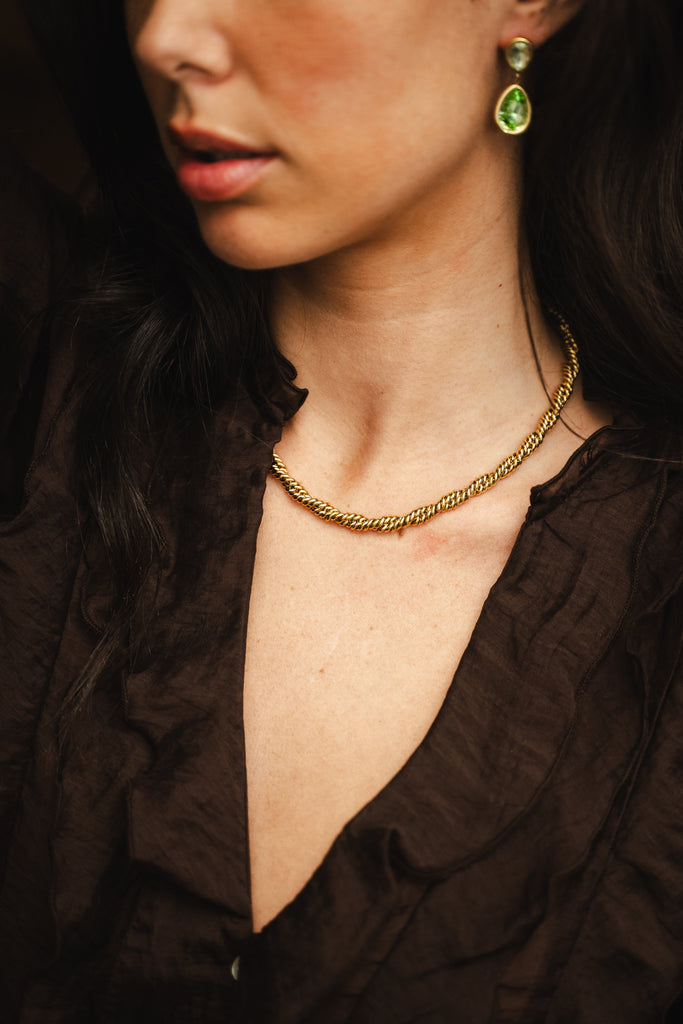 Conçu en acier inoxydable doré, le collier Angie brille d'un éclat durable. Sa particularité réside dans sa maille "corde", caractérisée par un tressage fin et serré qui lui donne un volume somptueux et une texture visuelle captivante. Avec une épaisseur de 0,70 cm, cette chaîne est suffisamment présente pour être portée seule comme une pièce "statement" minimaliste, tout en restant légère et confortable.