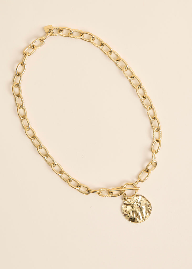 Ce collier se distingue par sa maille forçat unique, où un maillon sur deux présente une impression tressée et lisse. Il est conçu comme une pièce non réglable grâce à son fermoir bâton, qui sert d'élément décoratif. Au bout du collier, un médaillon rond martelé et épais apporte une touche finale à la fois tendance et lumineuse. Sacha est le bijou parfait pour celles qui recherchent une pièce forte, élégante et facile à porter.