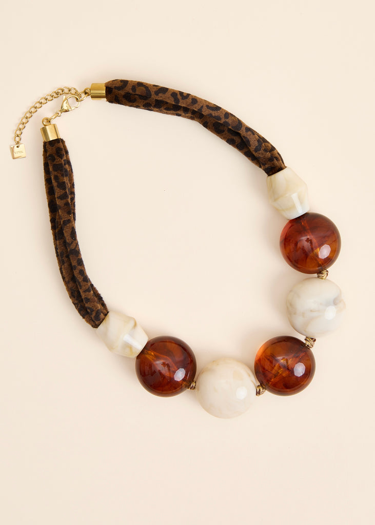 - Composition : Perles en résine (couleur crème et ambre) et tissu épais à motif léopard.